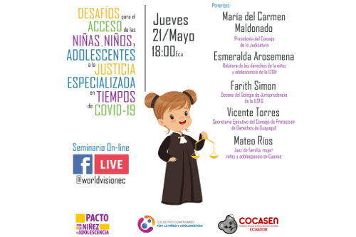 Seminario on-line transmitida el 21 de mayo de 2020. Organizada por el Pacto por la Niñez y la Adolescencia, el Colectivo Compromiso por la Niñez y Adolescencia, y la Coalición contra el Abuso Sexual a la Niñez Ecuador COCASEN.