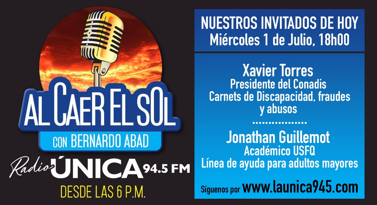 Publicado originalmente por Radio Única: Bernardo Abad, durante su programa Al Caer El Sol, ha invitado a Jonathan Guillemot, director de la Linea de Ayuda para Adultos Mayores de la Universidad San Francisco de Quito USFQ.